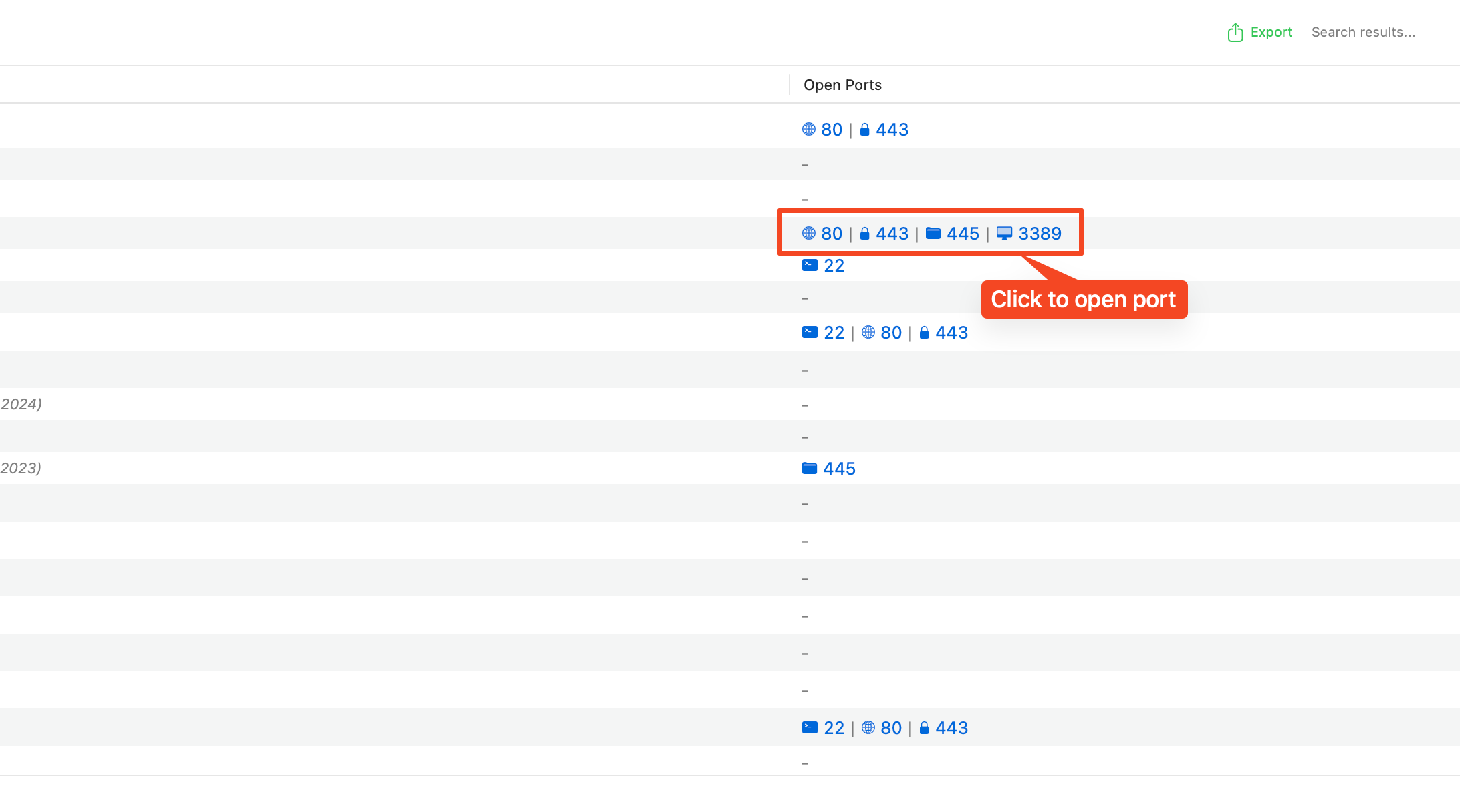 Method: 1. Click the port number in the Open Ports column 2. Or right-click the device → Connect to → [Service]