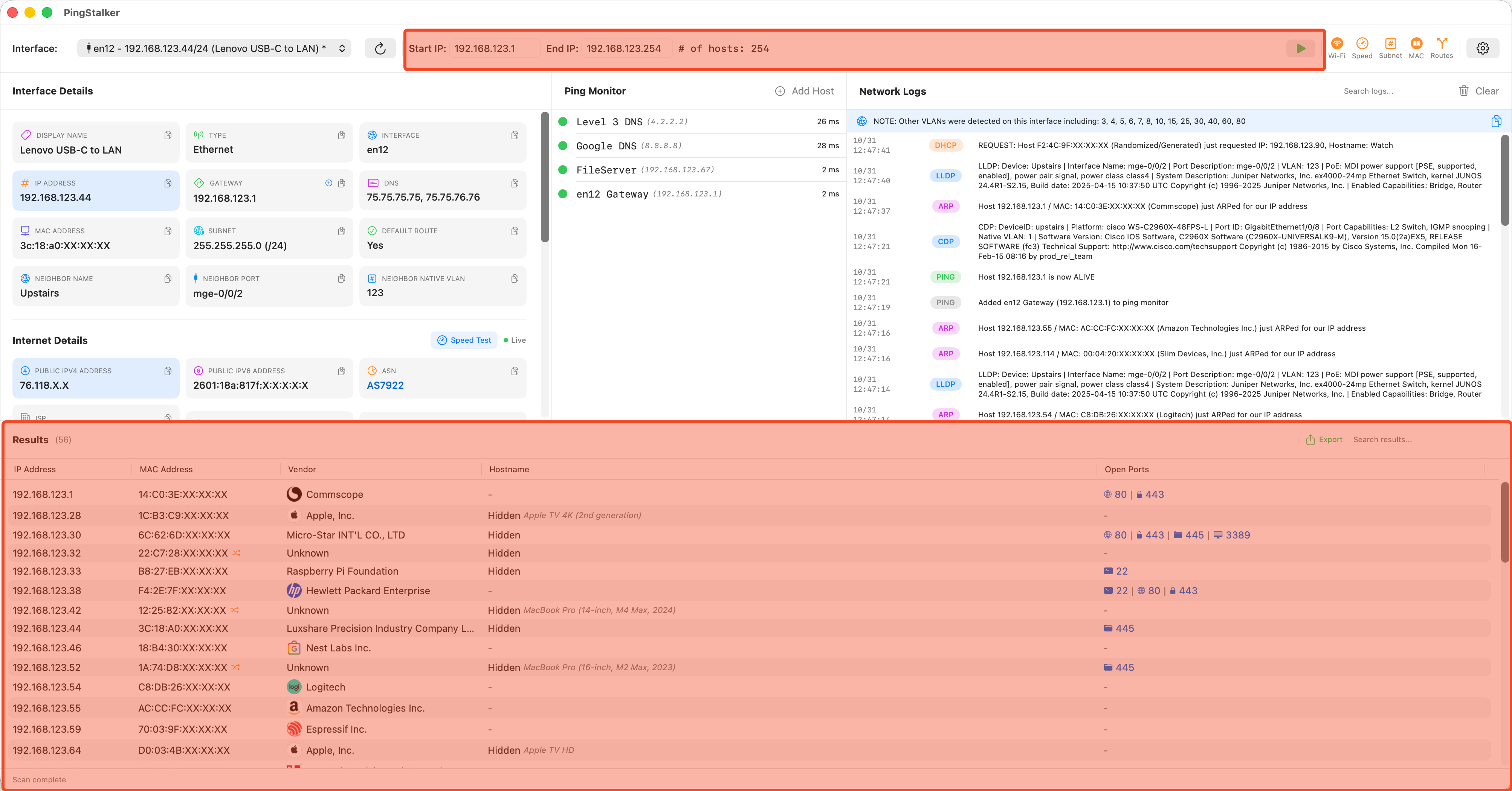 The Network Scan feature performs comprehensive device discovery on your local network using an advanced 11-phase scanning process. Results appear in the table at the bottom of the main window, showing all discovered devices with detailed information.