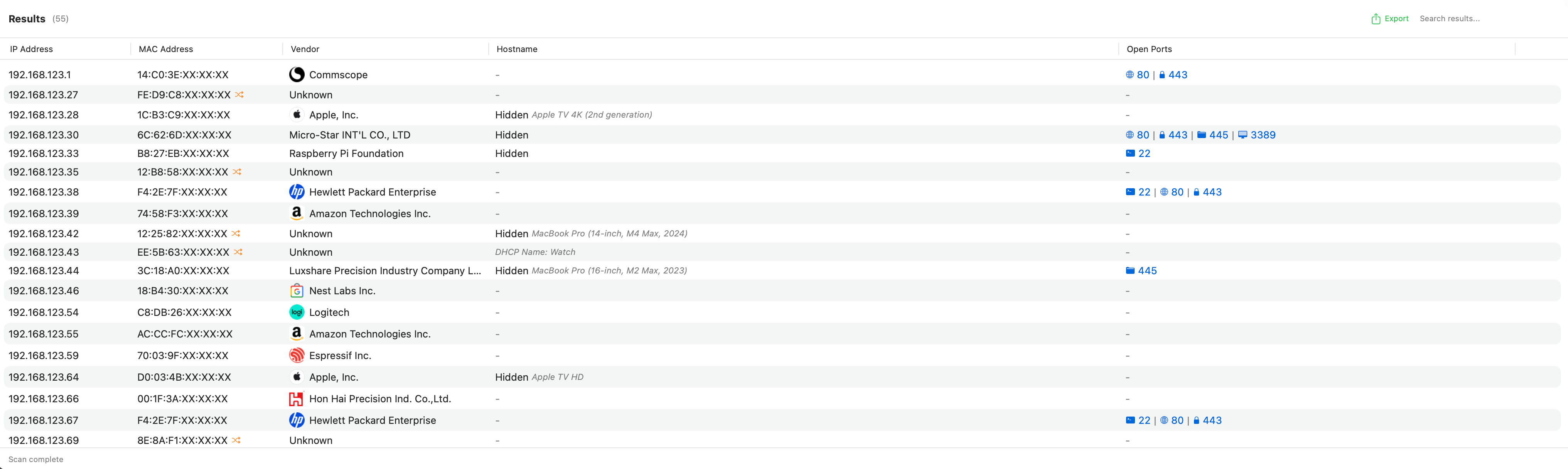 Tips: - Sort by Vendor to find all Apple devices - Sort by Open Ports to find all web servers - Search hostnames for specific devices