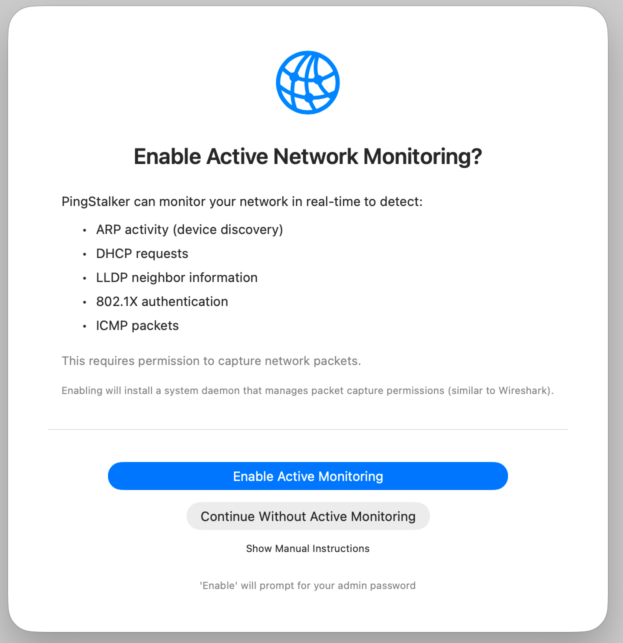 PingStalker will guide you through installing the ChmodBPF utility, which grants the necessary permissions.
