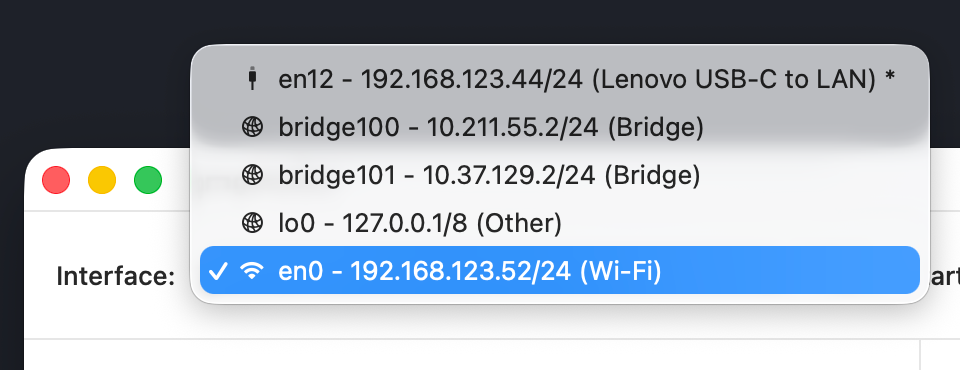 Display Format: Interfaces show their display name (e.g., "Wi-Fi") with the interface identifier in parentheses (e.g., "en0")