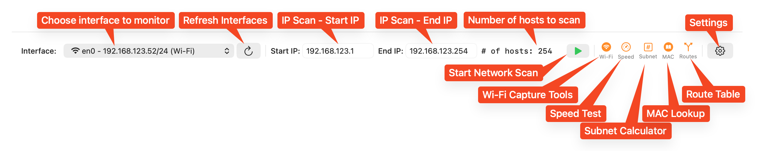 The leftmost section of the toolbar controls which network interface you're monitoring.